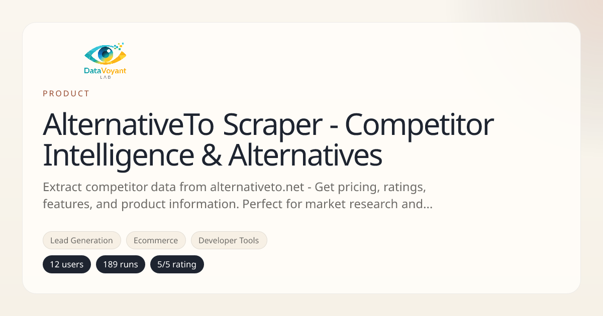 Extract competitor data from alternativeto.net - Get pricing, ratings, features, and product information. Perfect for market research and competitive analysis. Pay-per-event pricing