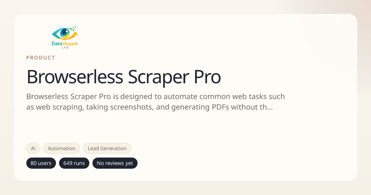 Browserless Scraper Pro is designed to automate common web tasks such as web scraping, taking screenshots, and generating PDFs without the need for manual browser interaction.